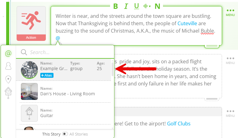 গল্পে আপনার গ্রুপটিকে যেখানে যেখানে দেখাতে চান, সেখানে অবশ্যই তাদের ট্যাগ করুন। উদাহরণস্বরূপ, যদি আপনার দশজনের একটি গ্রুপ থাকে যার মধ্যে আপনার পাঁচটি চরিত্রকে অন্তর্ভুক্ত করা হয়েছে, এবং আপনি কোনো একটি অ্যাকশনে সেই গ্রুপটিকে ট্যাগ করেন, তাহলে প্রকাশের সময় যখন আমরা সেই অ্যাকশনটিকে জীবন্ত করে তুলব, তখন আমরা নিশ্চিত করব যে আপনার পাঁচটি চরিত্র এবং আরও পাঁচটি এলোমেলো চরিত্র যেন শটে উপস্থিত থাকে। এই এলোমেলো চরিত্রগুলো আপনার গ্রুপের বর্ণনা অনুযায়ী দৃশ্যত তৈরি করা হবে, তাই আপনি যদি চান যে তারা একটি নির্দিষ্ট রূপে দেখাক, তবে অবশ্যই স্পষ্ট বিবরণ অন্তর্ভুক্ত করবেন।