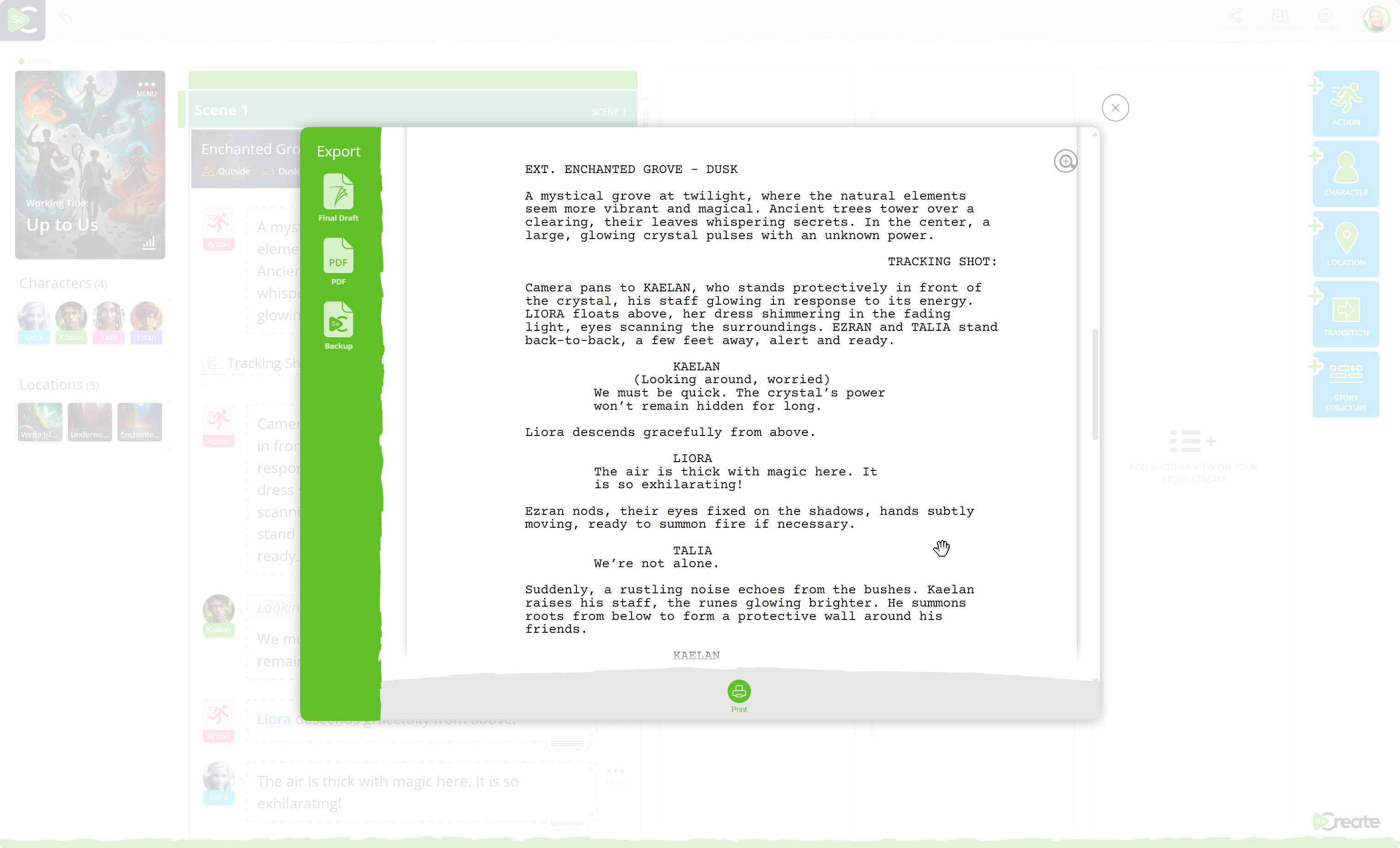 Script Formatting: Automatically format your screenplay to industry standards so you can focus on storytelling. With SoCreate, it just takes one click on the “export” button to see your story as a Hollywood-ready script! Print it or save it to a PDF format.