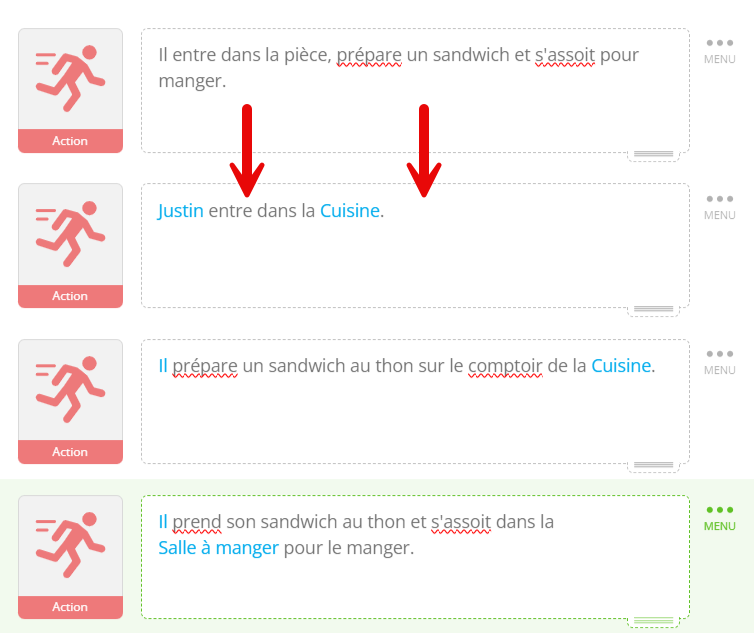 Vous souhaiterez éviter d’avoir plusieurs actions distinctes dans un seul bloc d’action. Par exemple : « Il entre dans la pièce, prépare un sandwich et s'assoit pour manger. » Puisque dans SoCreate Storyteller, vous n'obtenez qu'une seule image par élément d'action, cet exemple donnerait une seule image que notre IA choisirait. Pour obtenir un meilleur résultat, nous vous recommandons de diviser cette action unique en actions distinctes. Voici un exemple de cette action divisée en trois éléments d’action distincts.