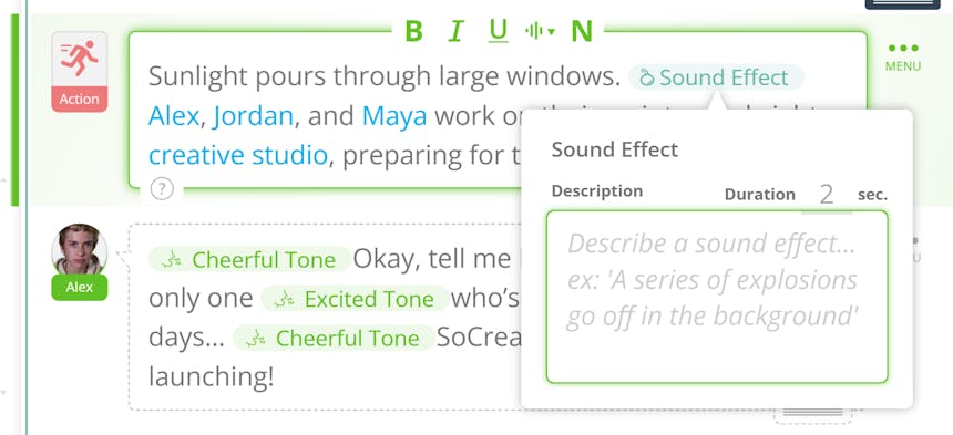 जब आपकी कहानी SoCreate Storyteller में एक्सपोर्ट होगी, तो AI साउंड इफ़ेक्ट जनरेट करेगा और उसे ठीक उसी जगह प्ले करेगा जहाँ आपने उसे रखा है। आपका डिस्क्रिप्शन जितना ज़्यादा स्पेसिफिक होगा, रिज़ल्ट उतना ही ज़्यादा इमर्सिव होगा।