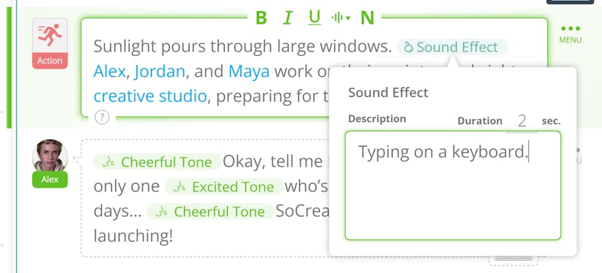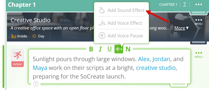 SoCreate राइटर खोलें और अब अपनी कहानी में साउंड इफ़ेक्ट डालें!