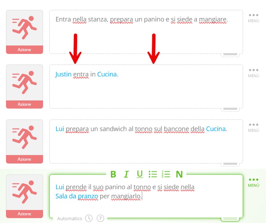 Dovrai evitare di avere più azioni distinte in un singolo blocco di azioni. Ad esempio: "Entra nella stanza, prepara un panino e si siede a mangiare". Poiché in SoCreate Storyteller ottieni solo un'immagine per azione, questo esempio risulterebbe in una singola immagine che la nostra IA sceglierebbe. Per ottenere un risultato migliore, ti consigliamo di suddividere questa singola azione in azioni separate. Ecco un esempio di questa azione suddivisa in tre azioni separate.