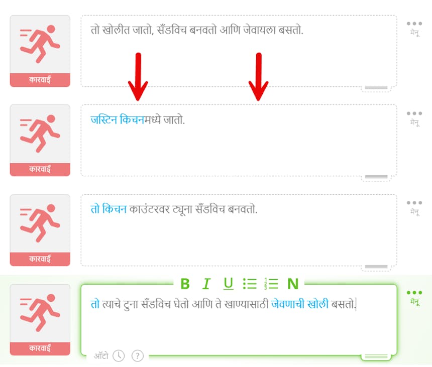 तुम्हाला एकाच ॲक्शन ब्लॉकमध्ये एकापेक्षा जास्त वेगळ्या क्रिया करणे टाळायचे आहे. उदाहरणार्थ, "तो खोलीत जातो, सँडविच बनवतो आणि जेवायला बसतो." SoCreate Storyteller मध्ये असल्याने, तुम्हाला प्रति कृती आयटम फक्त एक प्रतिमा मिळेल, या उदाहरणामुळे आमची AI निवडेल अशी एकच प्रतिमा मिळेल. एक चांगला परिणाम प्राप्त करण्यासाठी, आम्ही शिफारस करतो की तुम्ही या एकल क्रिया आयटमला वेगळ्या क्रिया आयटममध्ये विभाजित करा. या क्रियेचे तीन स्वतंत्र कृती आयटममध्ये विभागलेले उदाहरण येथे आहे.