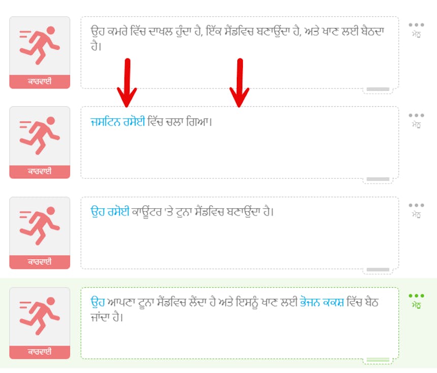 ਤੁਸੀਂ ਇੱਕ ਸਿੰਗਲ ਐਕਸ਼ਨ ਬਲਾਕ ਵਿੱਚ ਕਈ ਵੱਖਰੀਆਂ ਕਾਰਵਾਈਆਂ ਕਰਨ ਤੋਂ ਬਚਣਾ ਚਾਹੋਗੇ। ਉਦਾਹਰਨ ਲਈ, "ਉਹ ਕਮਰੇ ਵਿੱਚ ਦਾਖਲ ਹੁੰਦਾ ਹੈ, ਇੱਕ ਸੈਂਡਵਿਚ ਬਣਾਉਂਦਾ ਹੈ, ਅਤੇ ਖਾਣ ਲਈ ਬੈਠਦਾ ਹੈ।" ਕਿਉਂਕਿ SoCreate Storyteller ਵਿੱਚ, ਤੁਹਾਨੂੰ ਪ੍ਰਤੀ ਐਕਸ਼ਨ ਆਈਟਮ ਸਿਰਫ਼ ਇੱਕ ਚਿੱਤਰ ਮਿਲਦਾ ਹੈ, ਇਸ ਉਦਾਹਰਨ ਦੇ ਨਤੀਜੇ ਵਜੋਂ ਇੱਕ ਚਿੱਤਰ ਹੋਵੇਗਾ ਜੋ ਸਾਡੀ AI ਚੁਣੇਗਾ। ਇੱਕ ਬਿਹਤਰ ਨਤੀਜਾ ਪ੍ਰਾਪਤ ਕਰਨ ਲਈ, ਅਸੀਂ ਸਿਫ਼ਾਰਿਸ਼ ਕਰਦੇ ਹਾਂ ਕਿ ਤੁਸੀਂ ਇਸ ਸਿੰਗਲ ਐਕਸ਼ਨ ਆਈਟਮ ਨੂੰ ਵੱਖ-ਵੱਖ ਐਕਸ਼ਨ ਆਈਟਮਾਂ ਵਿੱਚ ਵੰਡੋ। ਇੱਥੇ ਇੱਕ ਉਦਾਹਰਨ ਹੈ ਇਸ ਕਾਰਵਾਈ ਨੂੰ ਤਿੰਨ ਵੱਖ-ਵੱਖ ਐਕਸ਼ਨ ਆਈਟਮਾਂ ਵਿੱਚ ਵੰਡਿਆ ਜਾ ਰਿਹਾ ਹੈ।