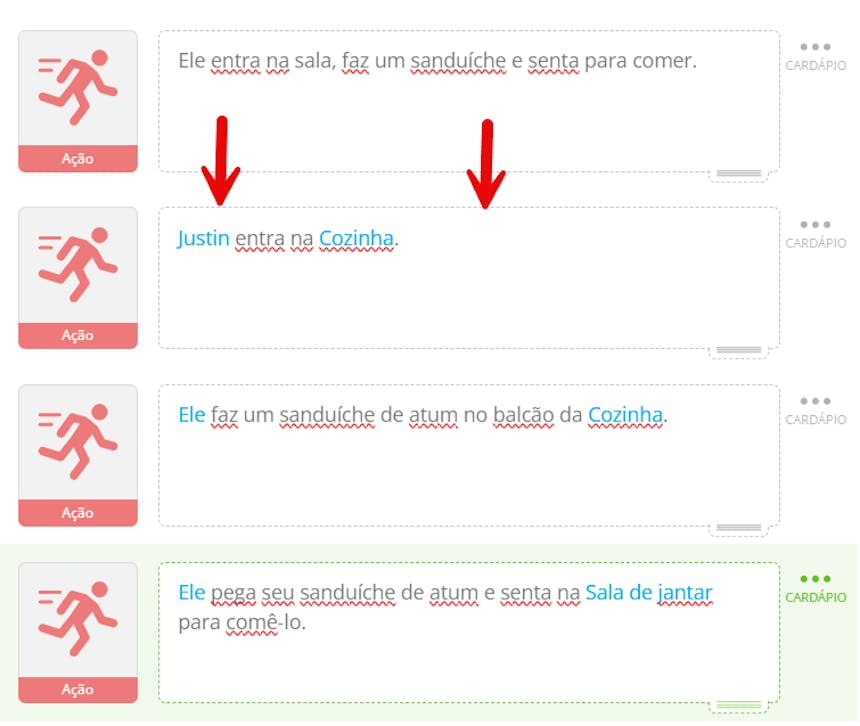 Você desejará evitar múltiplas ações distintas em um único bloco de ação. Por exemplo: “Ele entra na sala, faz um sanduíche e senta para comer”. Como no SoCreate Storyteller você obtém apenas uma imagem por item de ação, este exemplo resultaria em uma única imagem que nossa IA escolheria. Para obter um resultado melhor, recomendamos que você divida esse único item de ação em itens de ação separados. Aqui está um exemplo desta ação sendo dividida em três itens de ação separados.