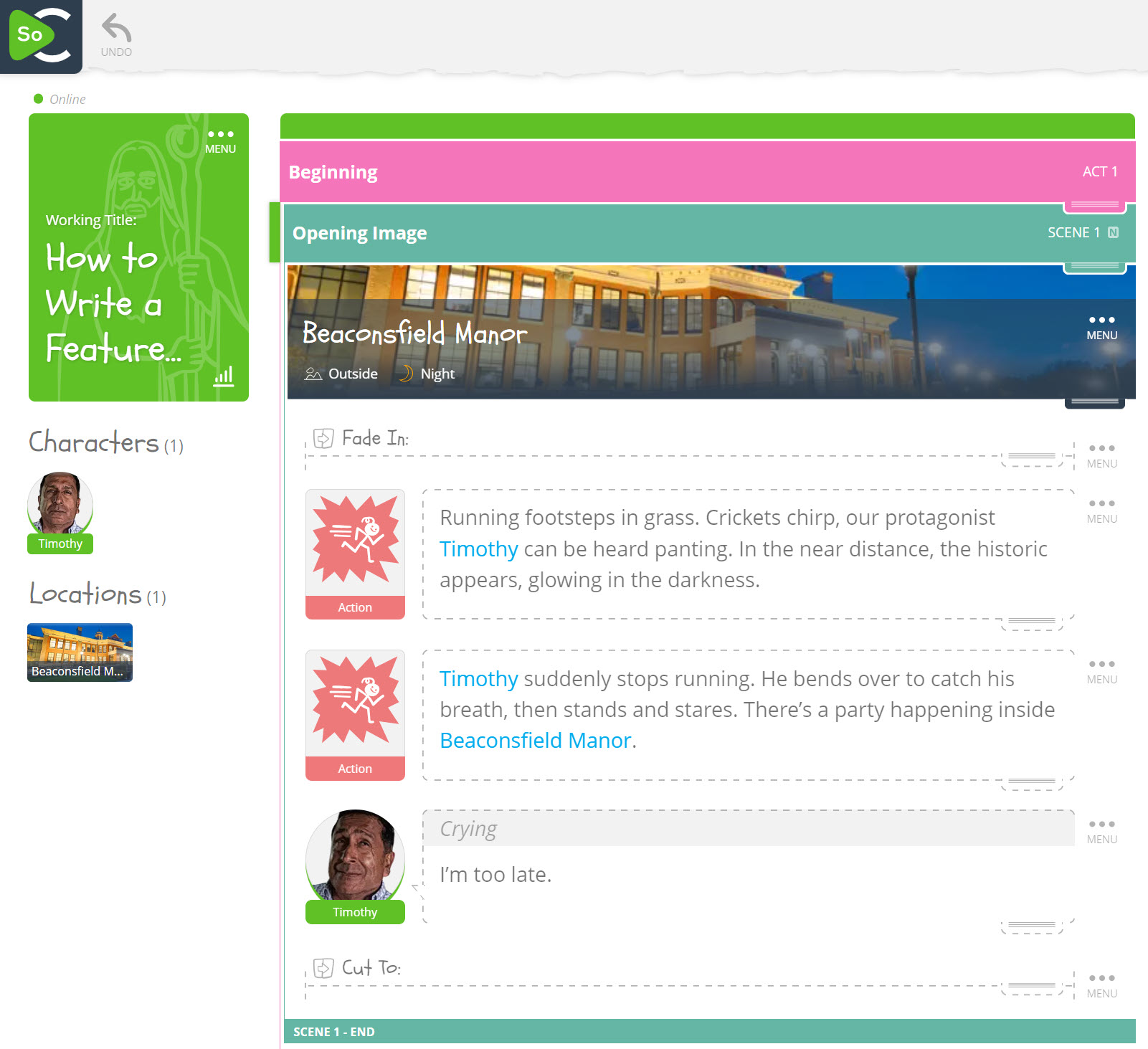 మీ కథ మరియు అవుట్లైన్ సిద్ధమైనతరువాత, మీ స్క్రిప్ట్ రాయడానికి సమయం వచ్చింది. SoCreate స్క్రీన్ రైటింగ్ సాఫ్ట్వేర్ ఒక శుభ్రమైన మరియు వినియోగదారు-మిత్రమైన ఇంటర్ఫేస్ను కలిగి ఉంది, ఇది మీ రచనపై కేంద్రీకరించడంలో మరియు మీ కథనంలో మునిగిపోవడం చేసేందుకు అనుకూలం!
